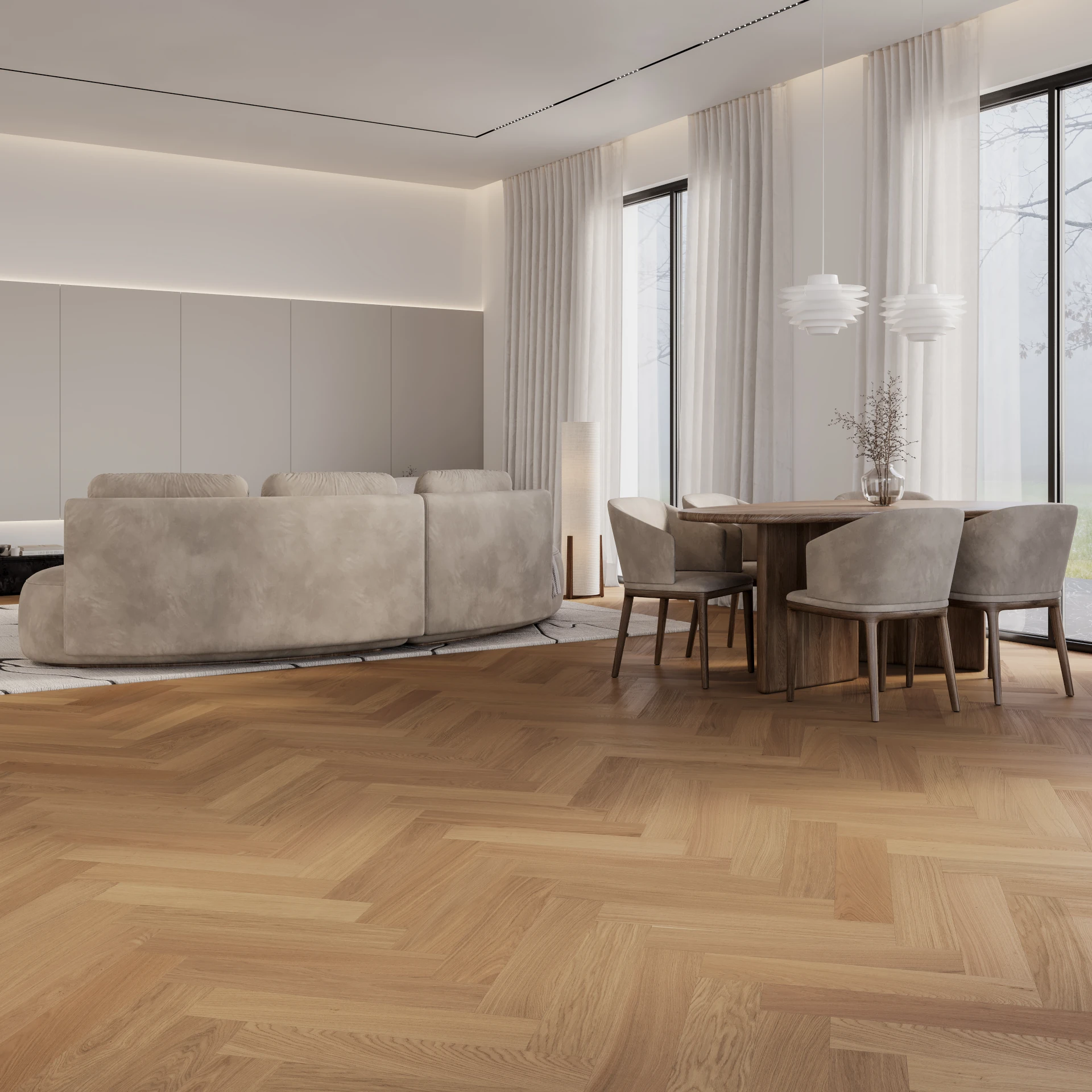 Dąb Essenza Esthetic Jodła Klasyczna 126 marki Barlinek to wyjątkowa podłoga, która łączy ponadczasowy wzór klasycznej jodełki z naturalnym pięknem dębu i nowoczesną technologią wykonania. Subtelna, ciepła kolorystyka drewna sprawia, że podłoga doskonale pasuje zarówno do wnętrz klasycznych, jak i nowoczesnych apartamentów.